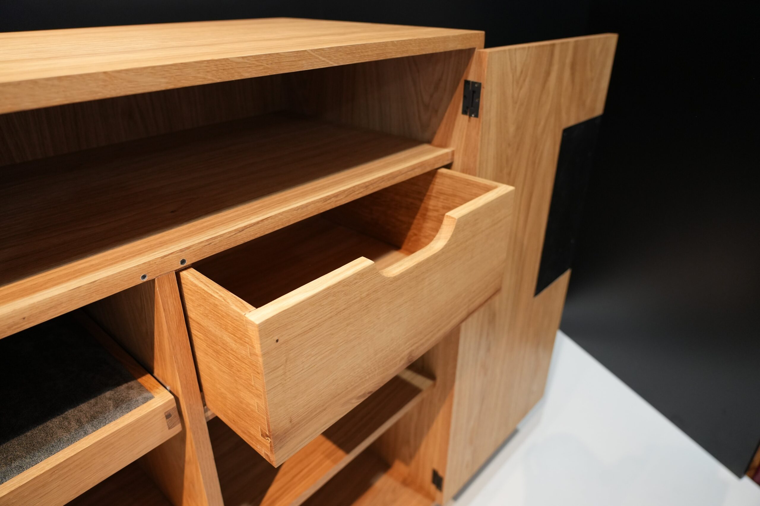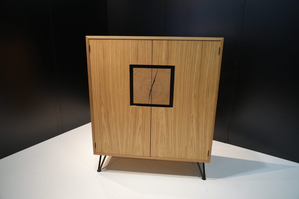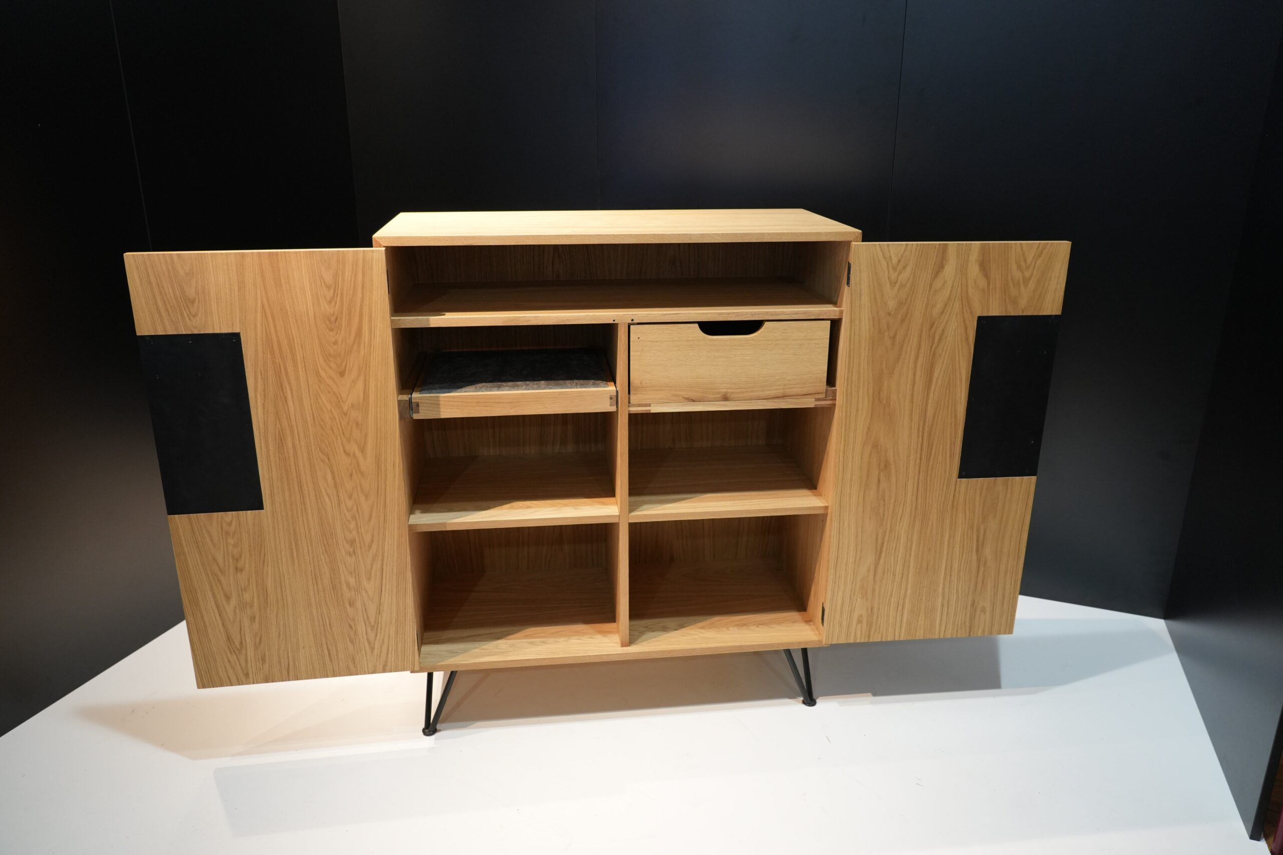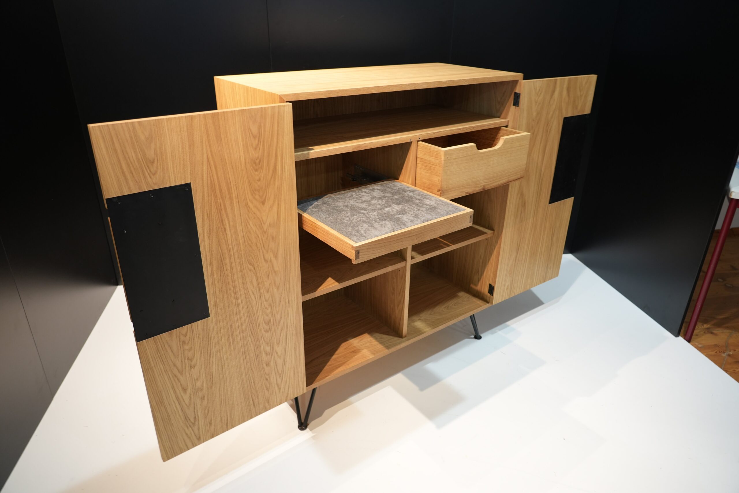Die von mir entworfene Anrichte besteht aus einem Korpus, gefertigt in Stäbchenplatten und ist in Eiche furniert. Der Korpus ist auf Gehrung geschnitten und mit Lamellos verbunden. Die Türen sind mittels Einstemmbänder innenliegend befestigt. Zusätzlich ist die Anrichte durch einen Mittelboden und eine Mittelseite aufgeteilt. Auf der linken Seite befindet sich ein Schmuckablagefach, darunter ein Fach, welches beliebig höhenverstellbar ist. Hinter der rechten Türe verbirgt sich im oberen Bereich eine klassisch geführte Schublade, welche auf einem Laufrahmen und einer Streif- bzw. Kippleiste läuft. Darunter befindet sich ein Fach, das zusätzlichen Stauraum bietet. Als Gestell habe ich mich für zierliche, stabile Haarnadelfüße entschieden. Die Anrichte vereint Funktionalität mit ästhetischem Anspruch. Die Oberfläche, welche zweimal mit farblosem Hartölwachs behandelt wurde, eignet sich ideal für Dekorationselemente, während das Innenleben ausreichend Platz für verschiedenste Gegenstände bietet.