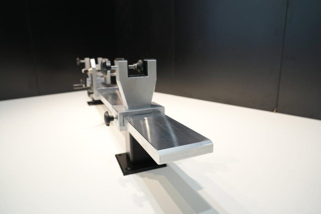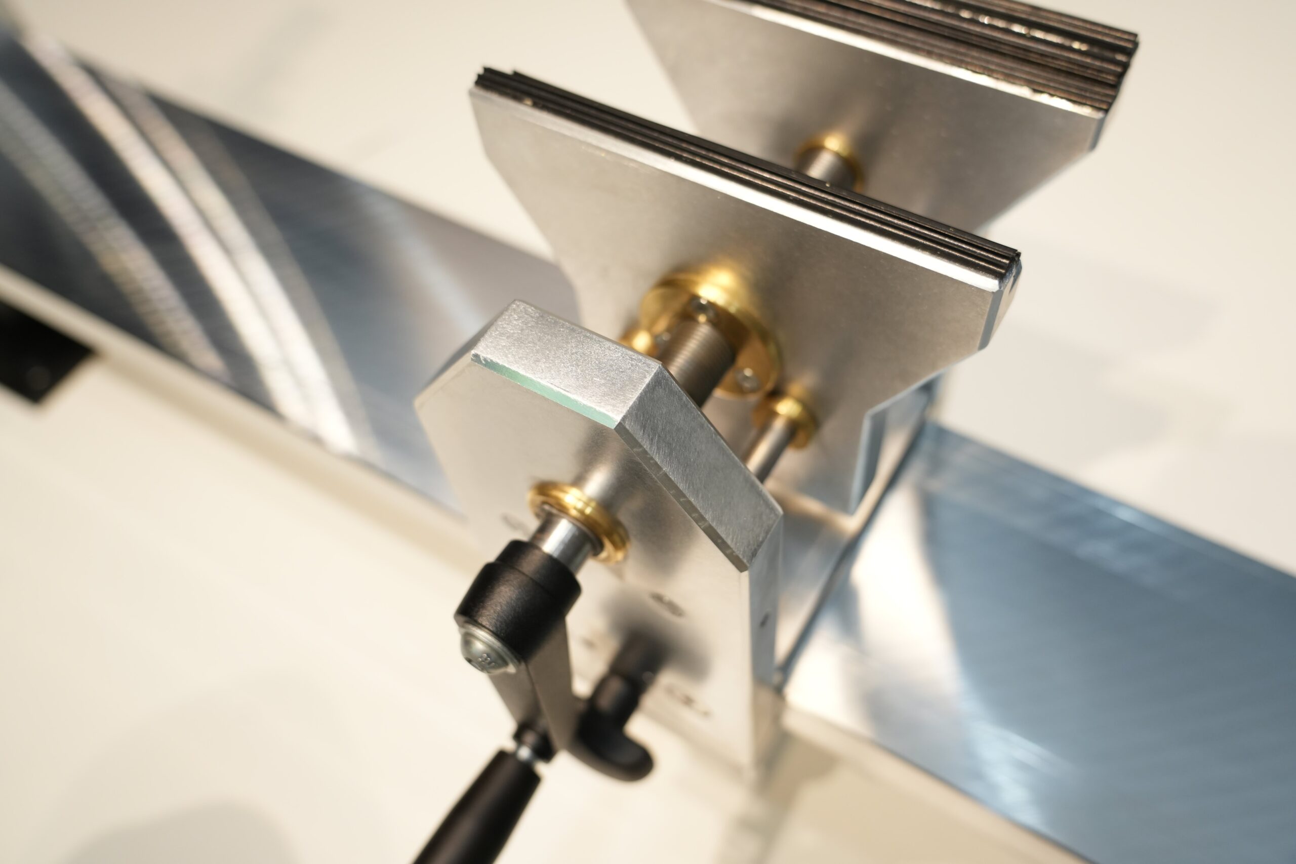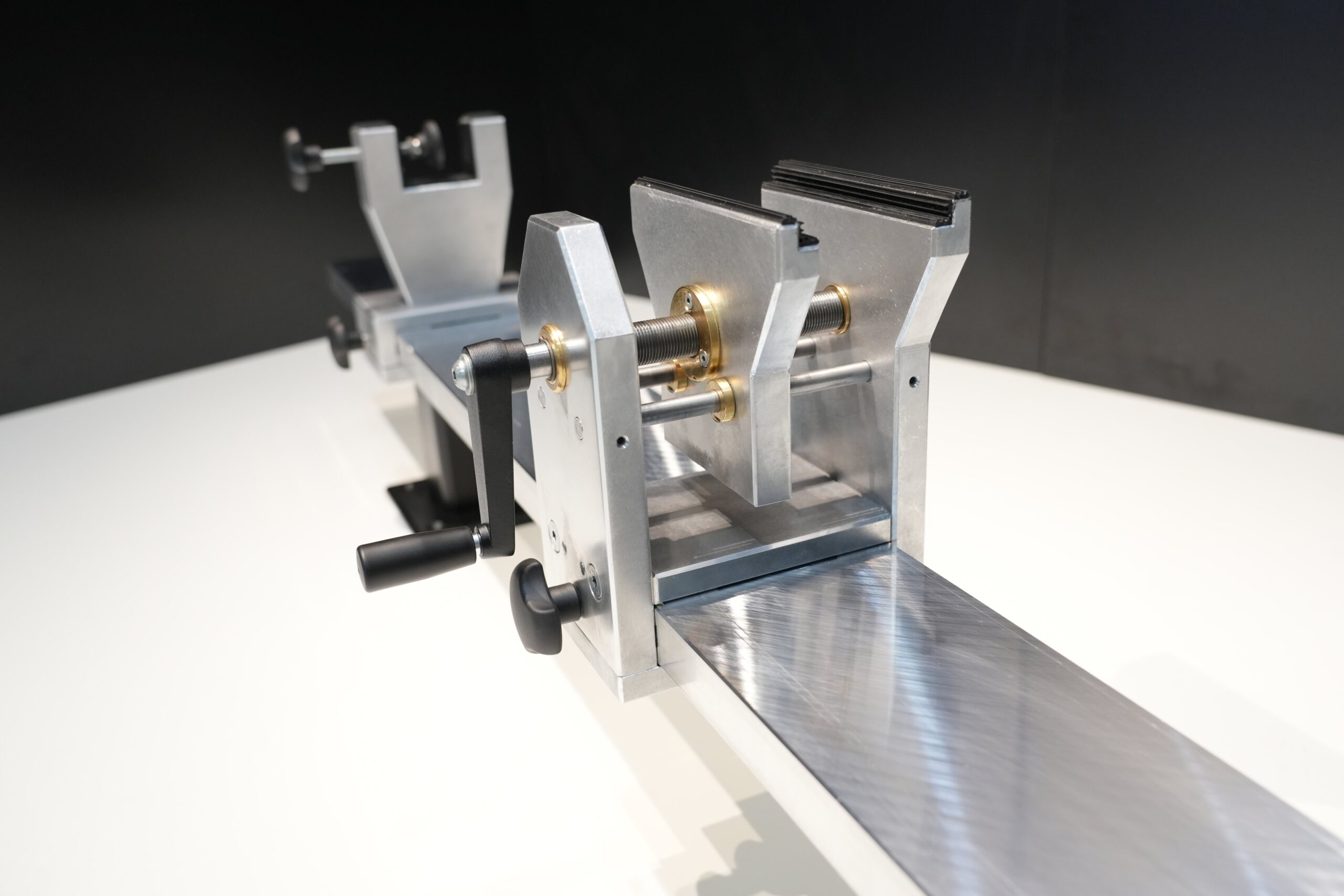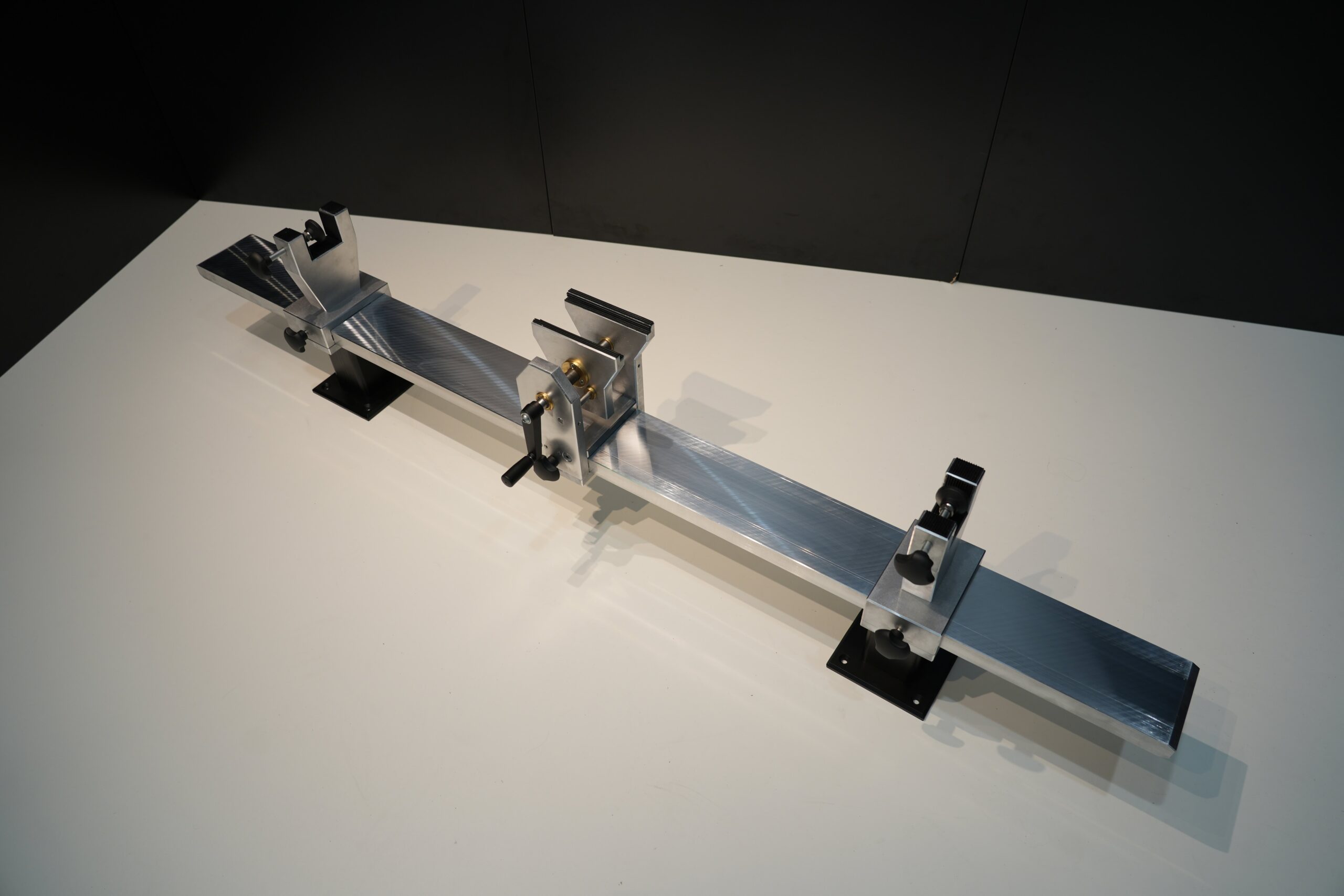 Die Skispannvorrichtung hebt das Präparieren von Skiern durch ihre solide und dennoch einfache Bauweise auf ein neues Niveau. Die Hauptkomponenten sind hochflexibel, sodass Pisten- und Tourenskier ebenso wie Freeride- und Rennski problemlos bearbeitet werden können. Die Auflageböcke befinden sich auf einer Aluminiumschiene beidseitig der zentralen Schraubstockeinheit und können mithilfe von Sterngriffen bei Bedarf verschoben werden. Dadurch lässt sich der Abstand der äußeren Auflagekomponenten individuell anpassen, sodass Skier unterschiedlichster Längen sicher eingespannt und komfortabel bearbeitet werden können. Das Herzstück der Vorrichtung ist die Zentraleinheit, deren Spannbackenbreite über eine Spindel flexibel verstellbar ist. Damit können auch Skier mit Mittelbreiten von über 110 mm sicher eingespannt werden.