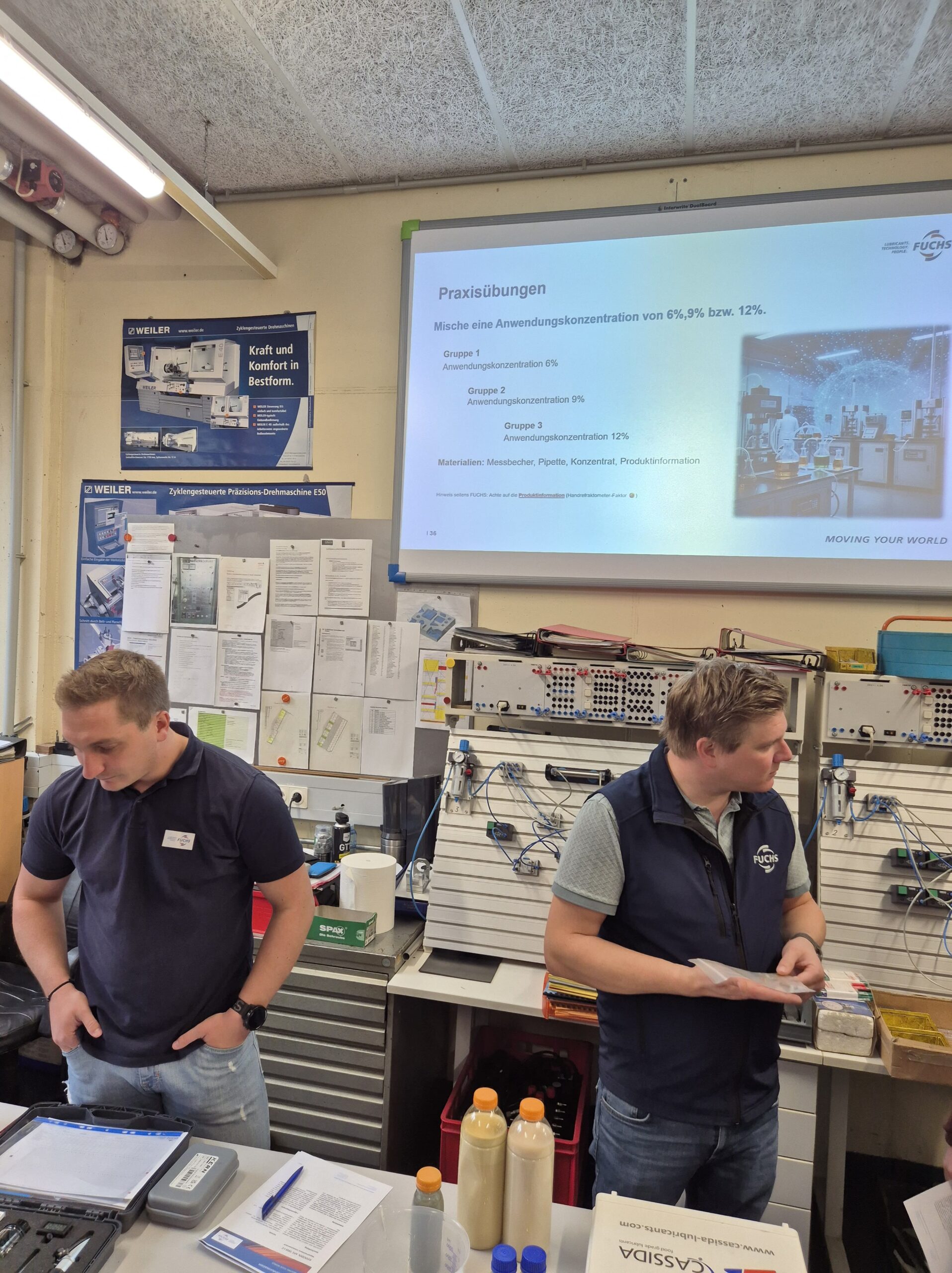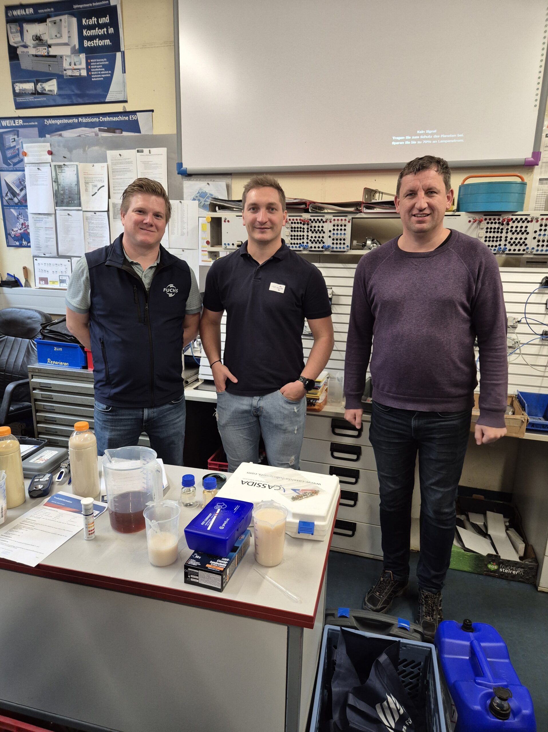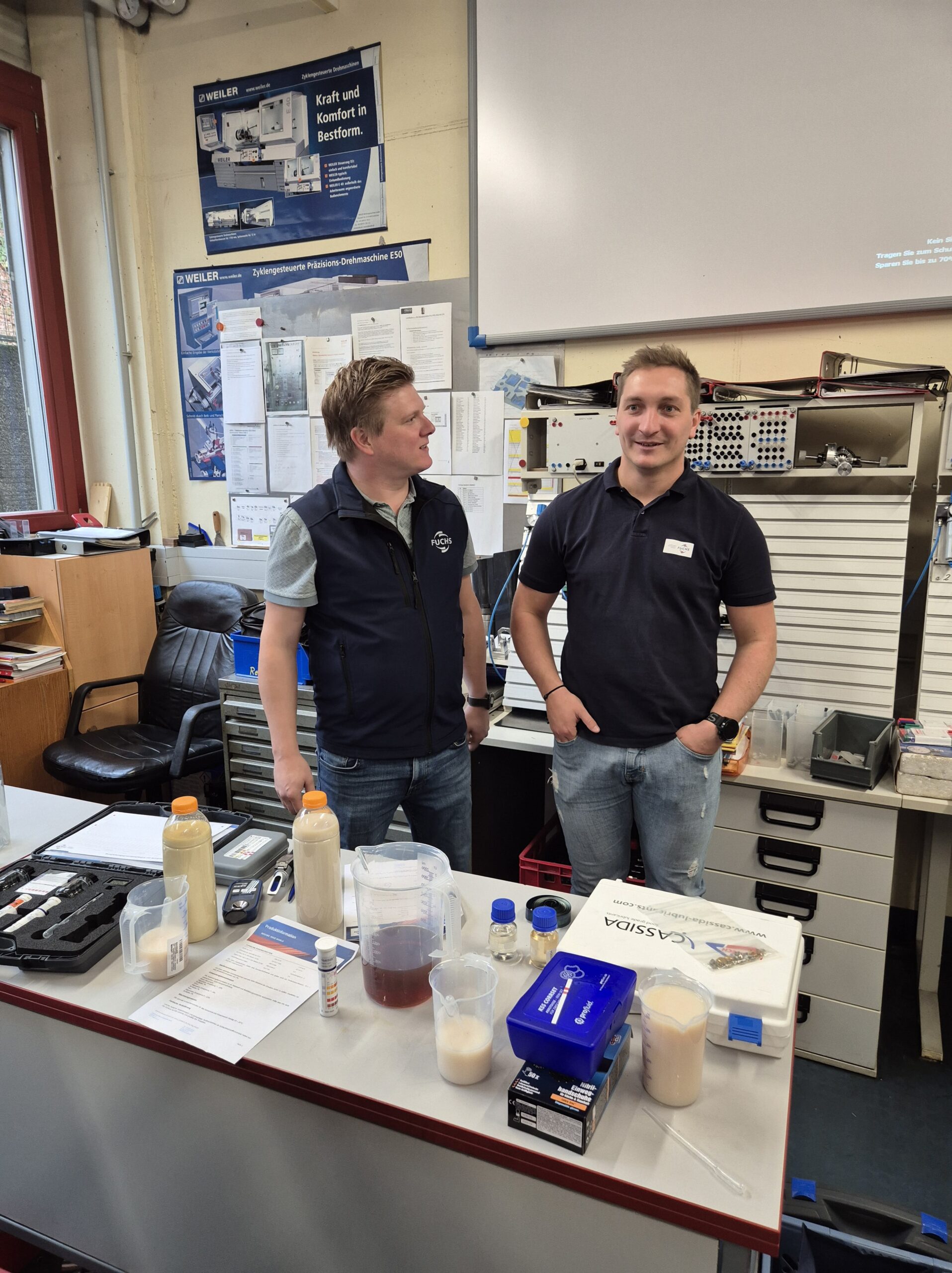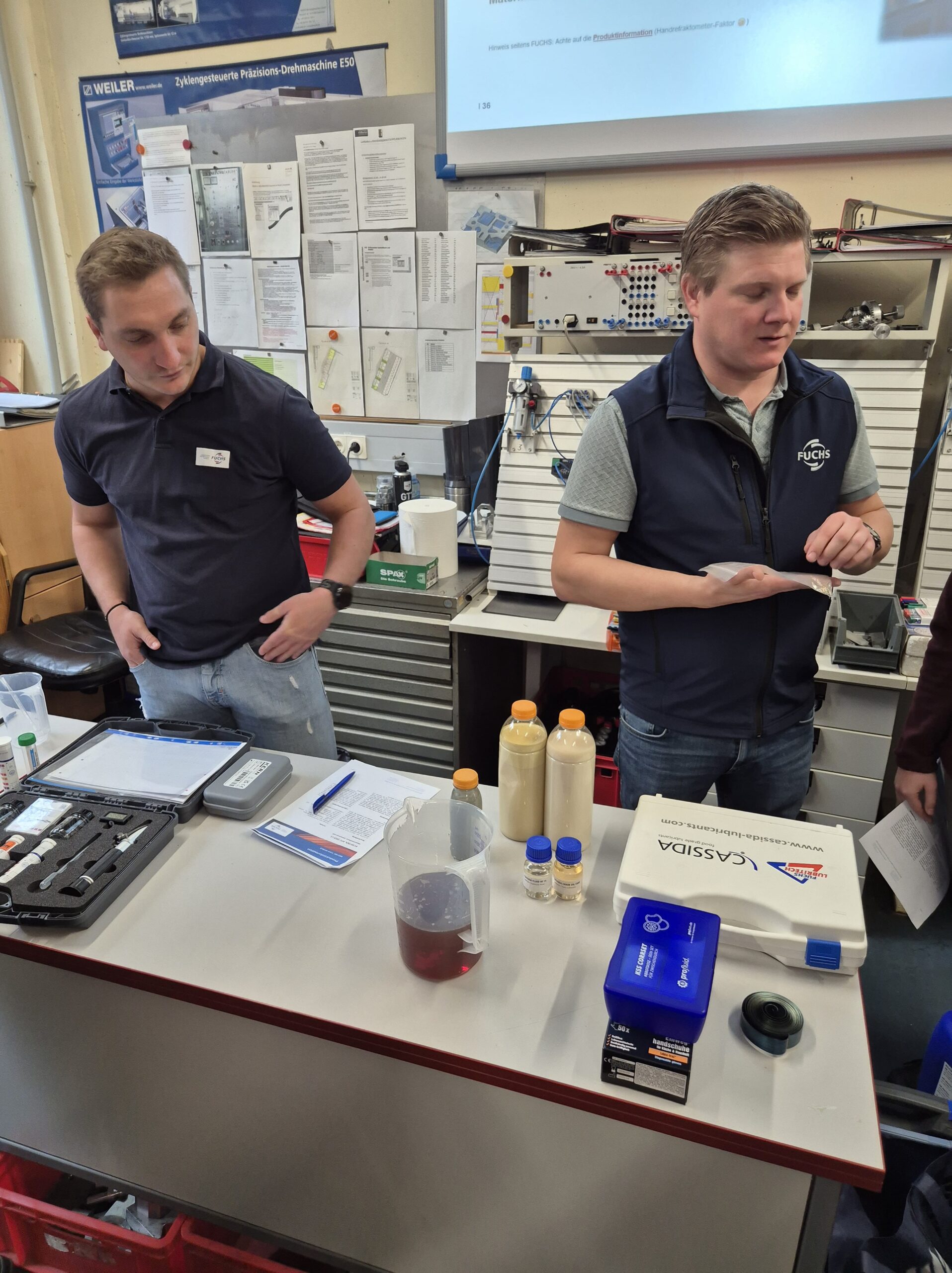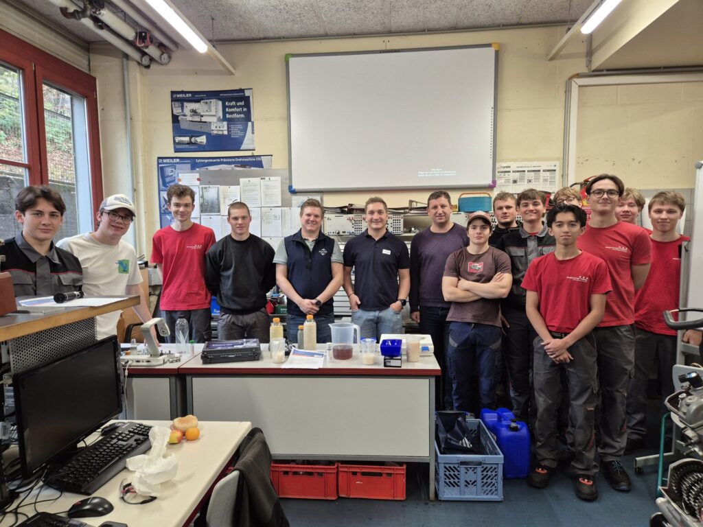 Während des Vortrags erhielten die Klassen einen umfassenden Einblick in die Normung, den Aufbau und die unterschiedlichen Einsatzbereiche von Ölen und Kühlmitteln. Die Expertinnen und Experten erklärten anschaulich, welche Anforderungen moderne Bearbeitungsmaschinen an Schmierstoffe stellen und wie wichtig die richtige Auswahl für Qualität und Sicherheit ist.
